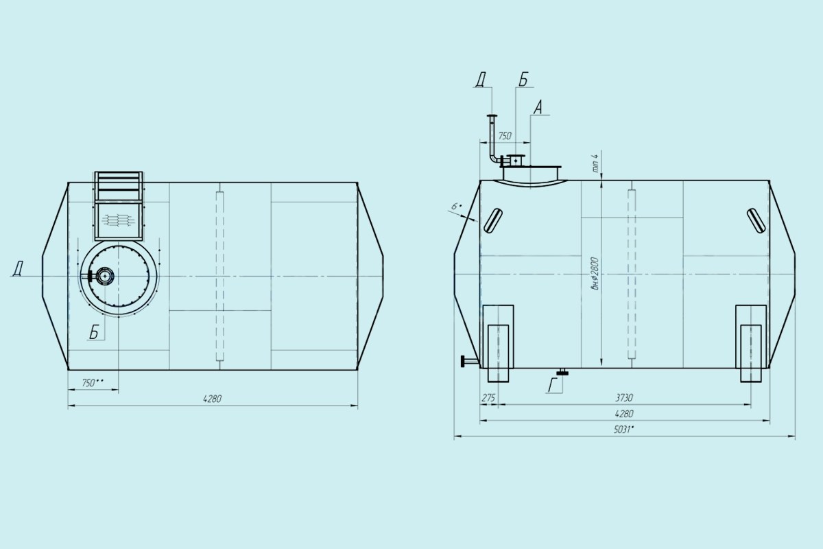 Горизонтальный резервуар емкостью 25 мЗ представляет собой сварной цельнометаллический сосуд цилиндрической формы. Основные и дополнительные элементы конструкции:
