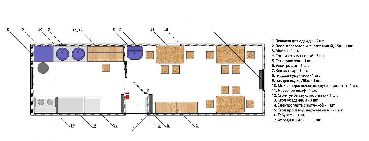 Чертеж Вагон-дом кухня столовая на 12 человек 8000х2500 мм
