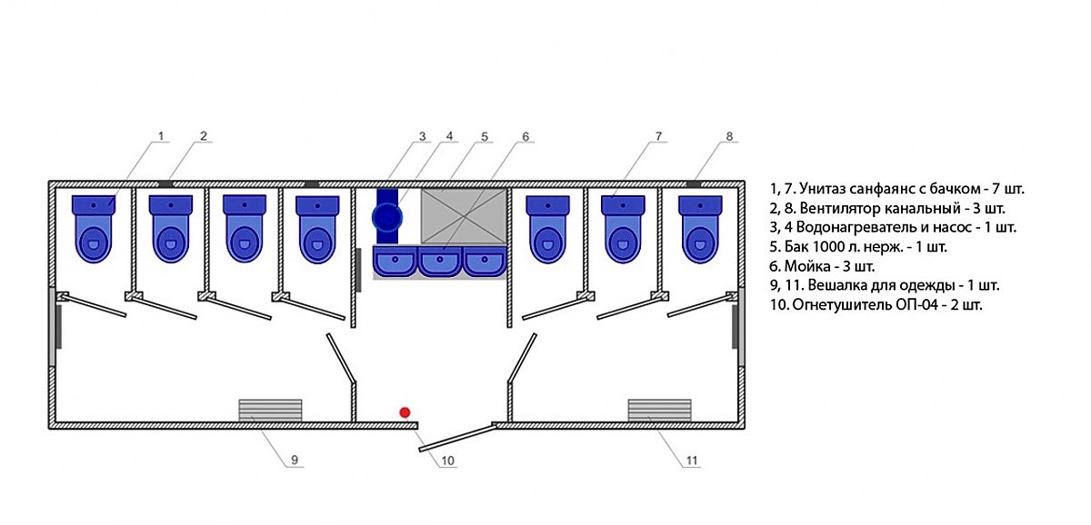 Укомплектованные вагон-дома санузлы размером 8000х2500 мм разработаны для использования на удаленных от коммуникаций объектов. Их особенностью следует считать грамотную внутреннюю организацию пространства, использование оптимального количества кабинок с необходимым сантехническим оборудованием. Заказать такие мобильные вагон-дома предлагаем от Завода Резервуаров и  Негабаритных Металлоконструкций. Доставляем конструкции в любой регион России.
